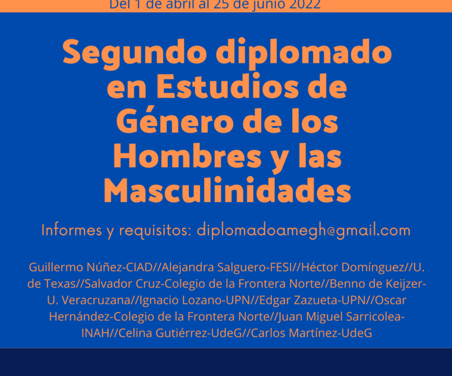 Uncategorized 25 Feb 2022 Segundo Diplomado en Estudios de Género de los Hombres y las Masculinidades La AMEGH te invita al Segundo Diplomado en Estudios de Género de los Hombres y las Masculinidades Modalidad virtual Del… María Esther Valle Morfín